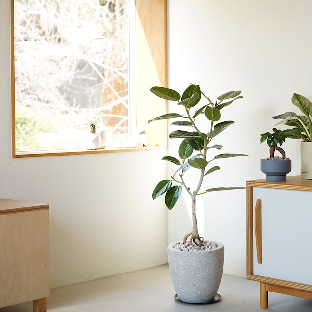 フィカス ベンガレンシス / Ficus benghalensis ▼サイズ 株全体 高さ:各樹形の写真に記載しています 植木鉢 鉢 直径:22 高さ:22.5(cm) ▼コメント 丸く大きな葉っぱが印象的なゴムノキ。 これ一鉢でお部屋を明るい印象に変えてくれます。 大きすぎず小さすぎず、程よいサイズ。 戸建てや広いリビングはもちろん、一人暮らしのワンルームにも。 キャビネットやテレビ台に並べて圧迫感なくスッキリ置けるフロアサイズです。 今は背丈が低め。ゆっくり背が高く成長するグリーン。 大きく育てるのもよし、剪定しながらコンパクトな樹形を保つこともできます。 将来はリビングのシンボルツリーに。 日当たり・風通しの良い場所に。明るい日陰もOK。 水やりは適宜。毎日水やりする必要はありません。 初心者さんでも育てやすい丈夫な植物です。 ・ギフト・プレゼントにもオススメです。 ・新築、引越、開院、移転祝いにどうぞ。 ・グレー系の色味、テラゾーの植木鉢。鉢底穴あり。受皿は黒いスチール製。 ・部分的に薄いヒビが入ることがあります。ヒビが広がって割れることはありませんのでご安心ください。 ・土の表面は軽石を敷いて化粧しています。 ・観葉植物の育て方メモ付き。 ・一点もの販売。写真の現品をご用意いたします。 ▼購入後のサポート 基本のお手入れ方法は、同封のリーフレットにてご案内しております。 万が一の不調や、環境に合わせた個別のご相談が必要な際は、公式LINE「みどりいろの窓口」へご連絡ください。 当店スタッフが実際の様子(お写真等)を直接拝見し、解決へ向けたアドバイスをさせていただきます。 https://lin.ee/0ODyDKP ✿大切な植物を無事にお届けするため、送料やよくあるご質問をご案内しております。安心してお迎えいただくために、ご購入前にぜひ一度ご覧ください。 https://shop.ayanas.jp/p/00005