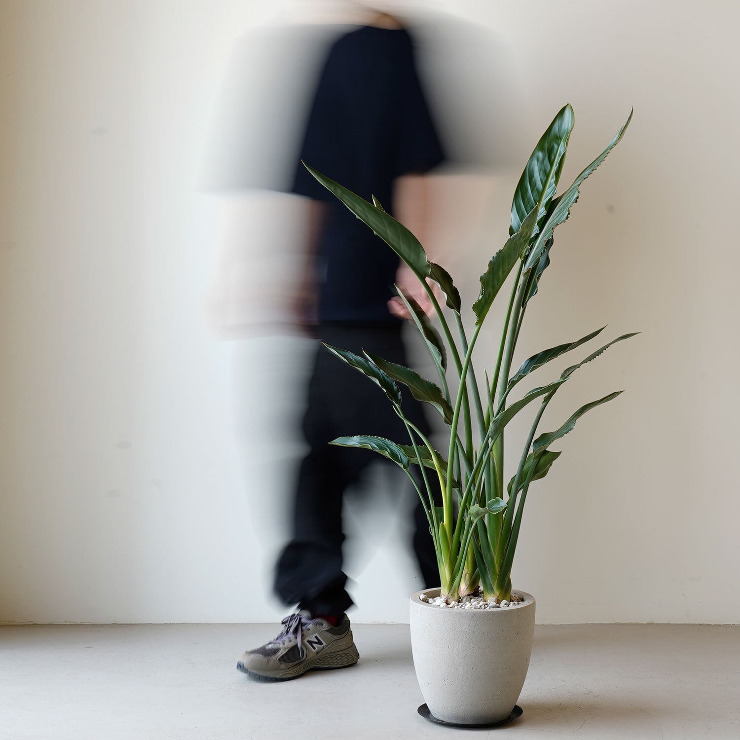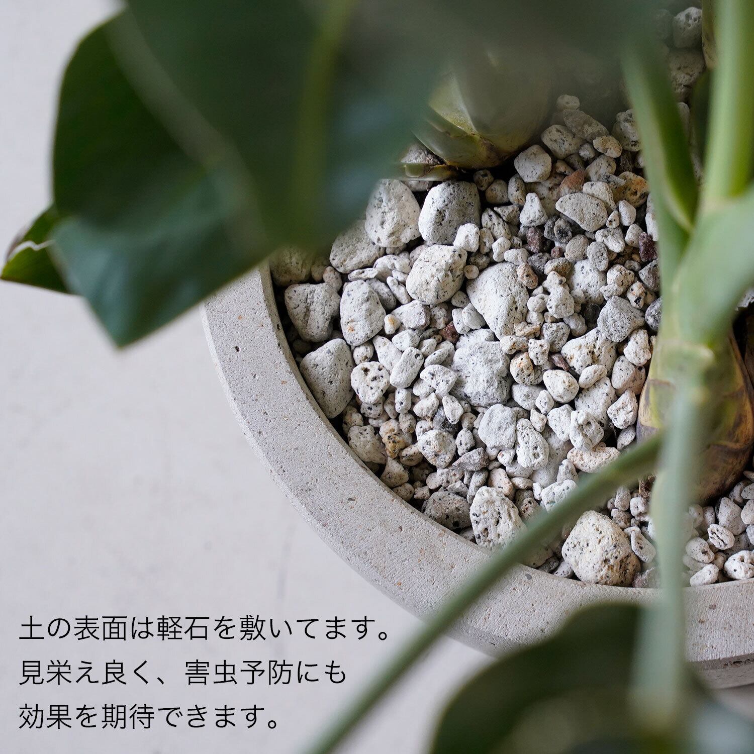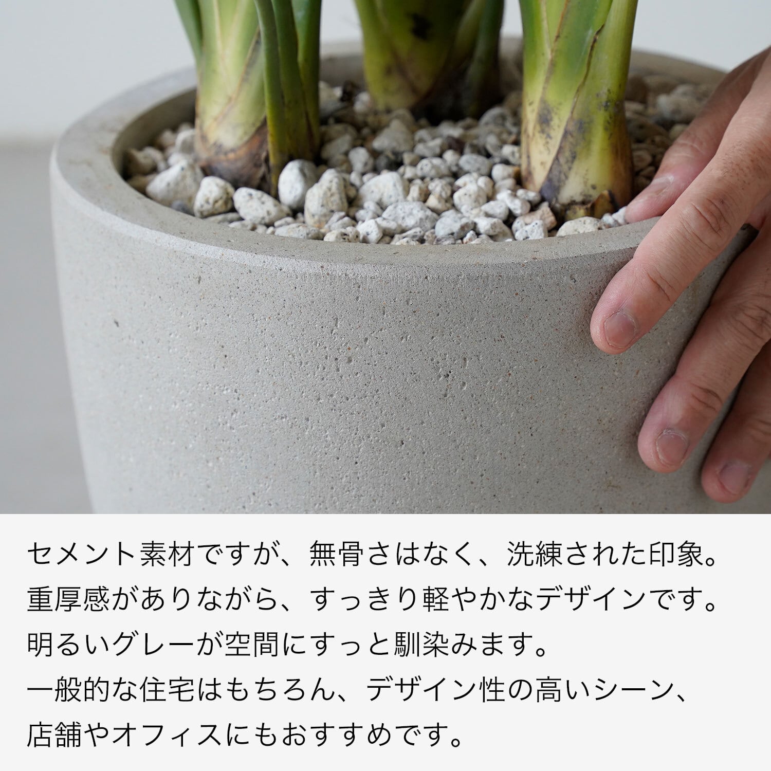 鉢はマットな質感のセメント製。ボテッと重厚感がありながらスッキリ軽やかなデザインです。一般的な住宅の白壁から、色や素材感のある店舗やオフィスの内装にも似合います。
