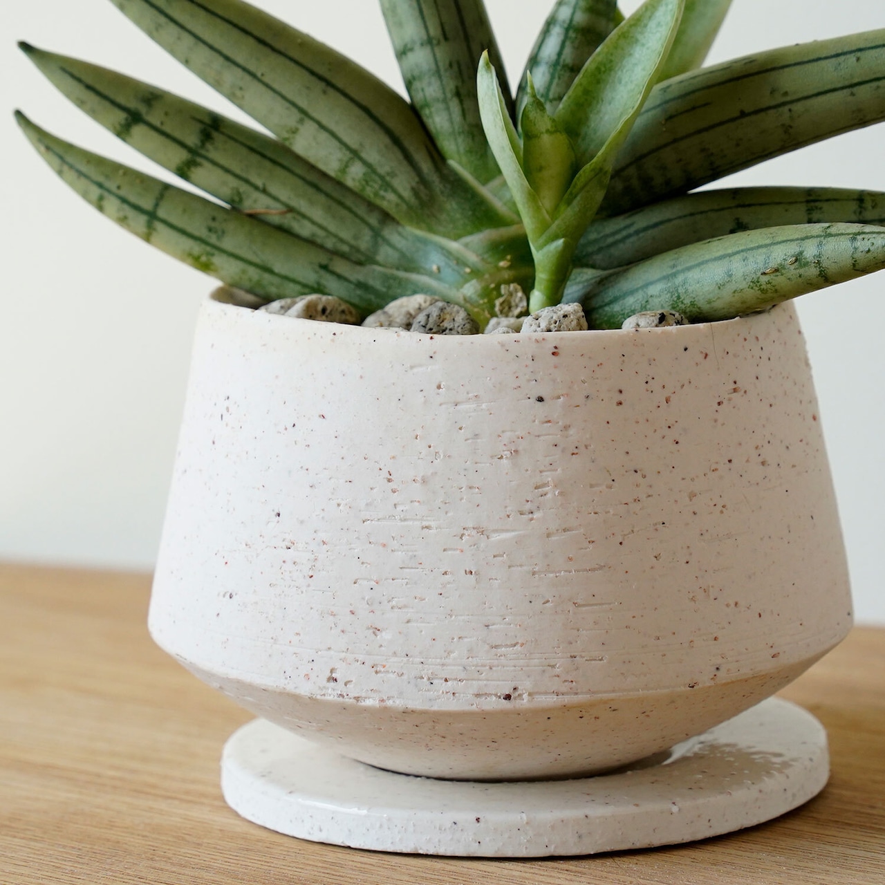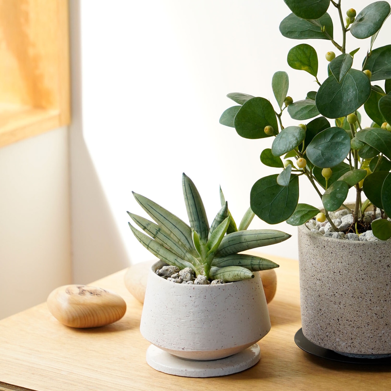 植物を引き立てるシンプルな陶器の植木鉢・受皿もセットです。