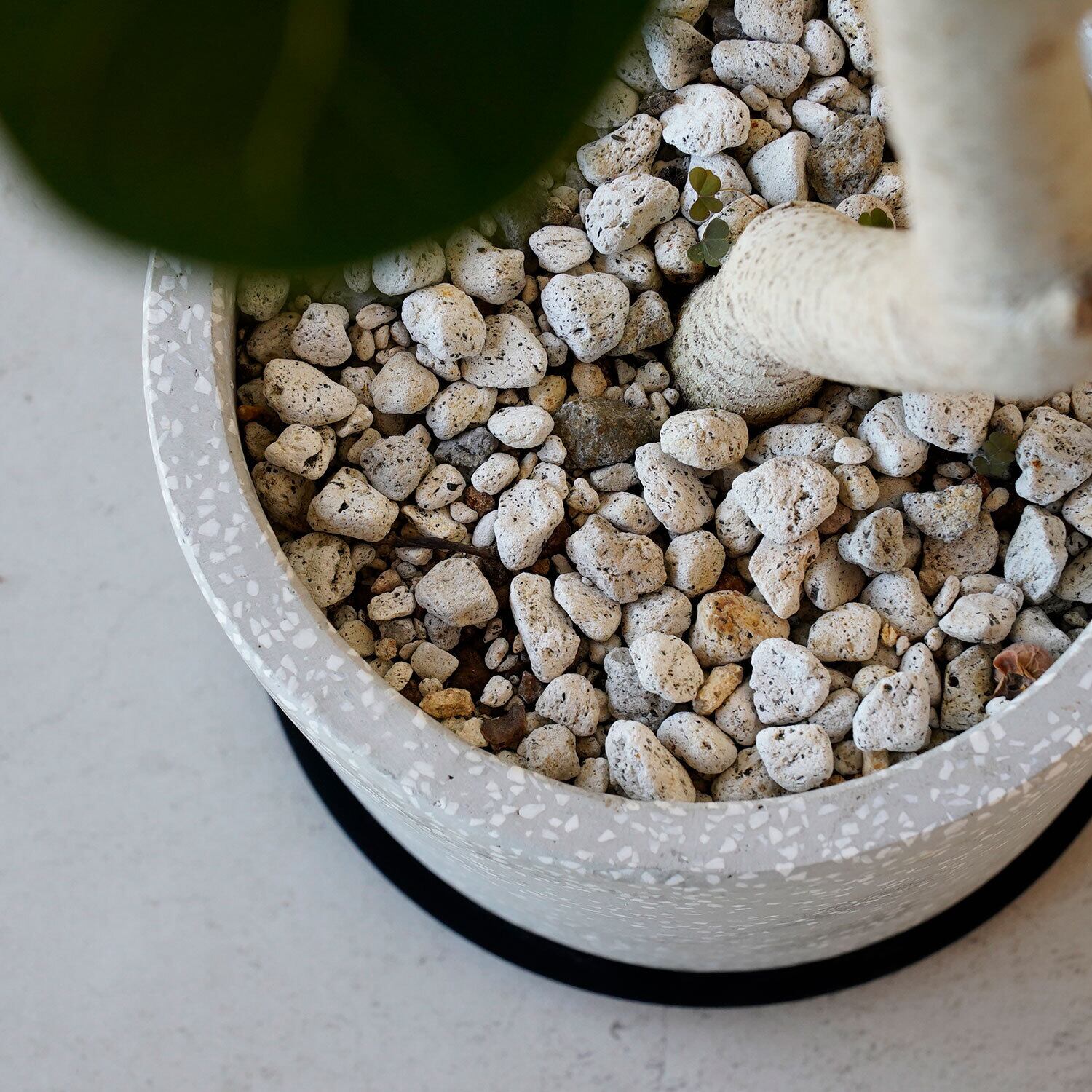 肉厚でボテッとしたシルエットが重厚感がありながらも可愛らしい印象です。ファイバーセメント、グレー地のテラゾー(削り出し)です。黒のスチール製受け皿が、全体をキュッと引き締めてくれます。