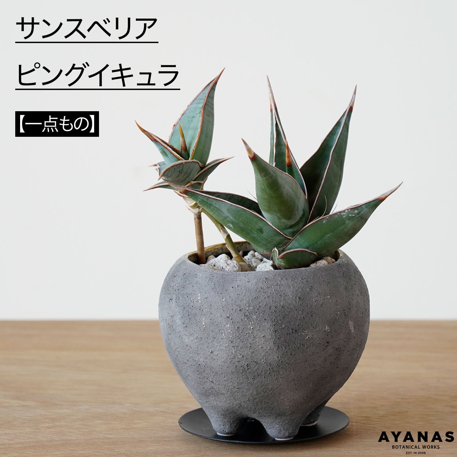 「ウォーキング サンスベリア」の流通名を持つピングイキュラ。足つきの鉢に合わせてみました。鉢は陶器、受皿はスチール製。