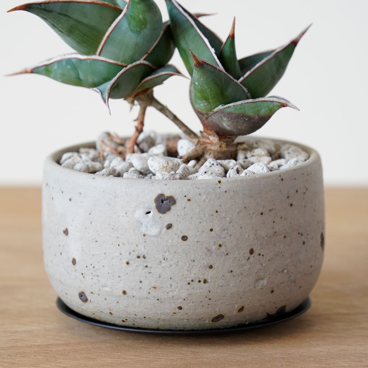 植物を引き立てる平鉢(浅い鉢)。受皿はスチール製。
