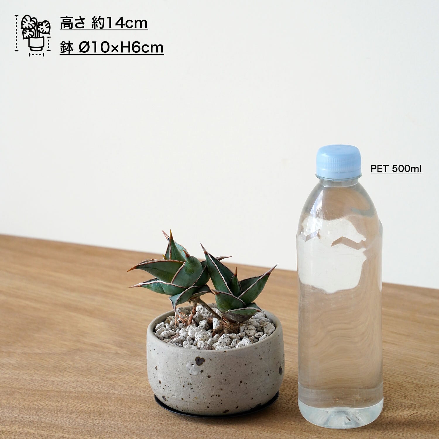 片手で持てるテーブルサイズ。小さい鉢植えなので、置き場所を選ばずに置けます。