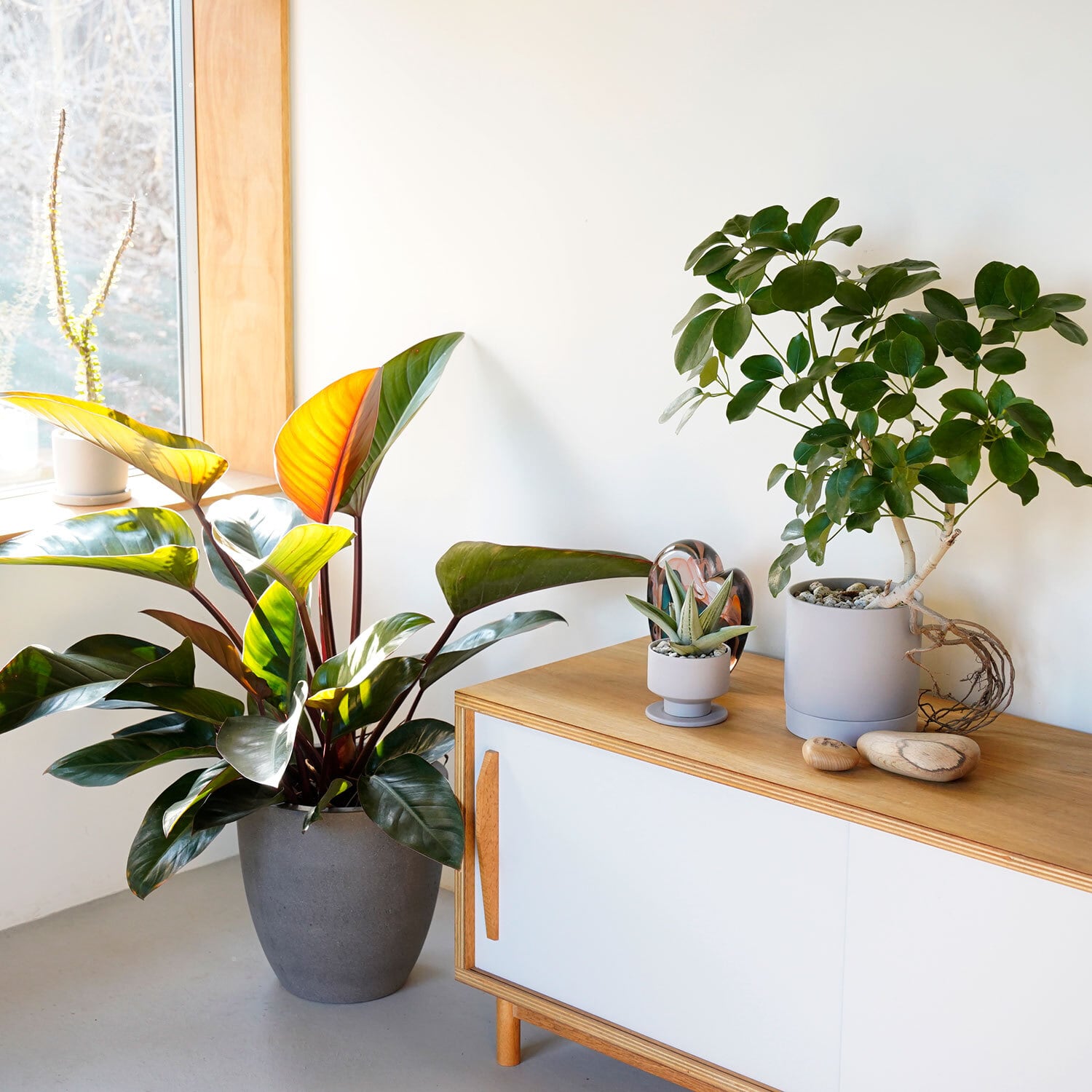 植物を引き立てるシンプルなグレーの鉢・受皿のセット。陶器製。鉢底穴あり。