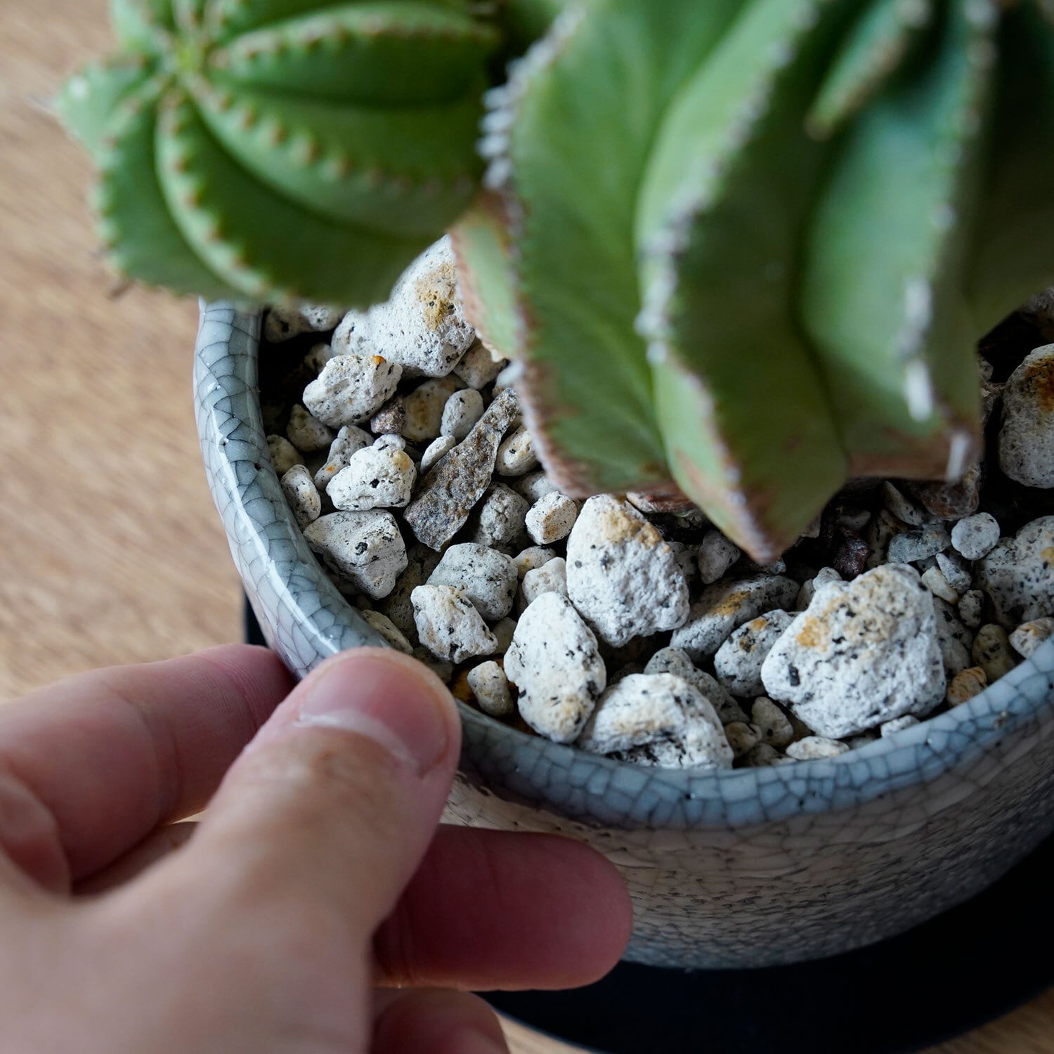土の表面に敷いてる軽石を退けてみて、土がサラサラに乾いていたらたっぷりと水やり。毎日与える必要はありません。