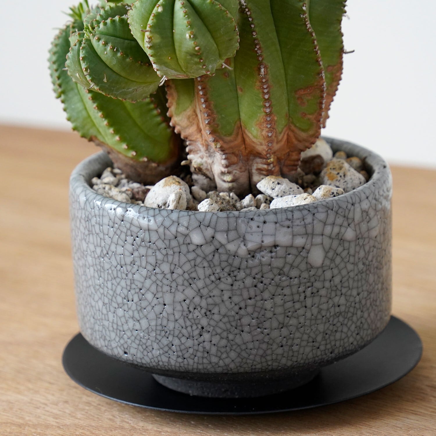 植物を引き立てるシンプルな陶器の鉢、スチールの受皿のセット。