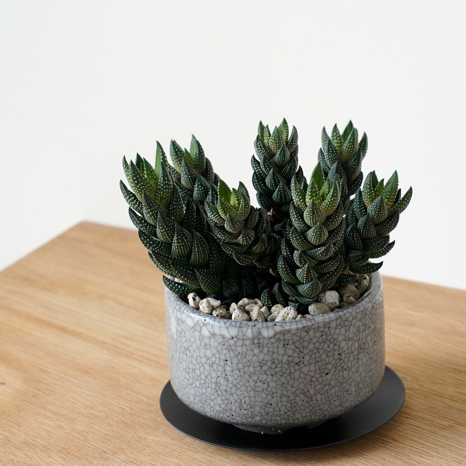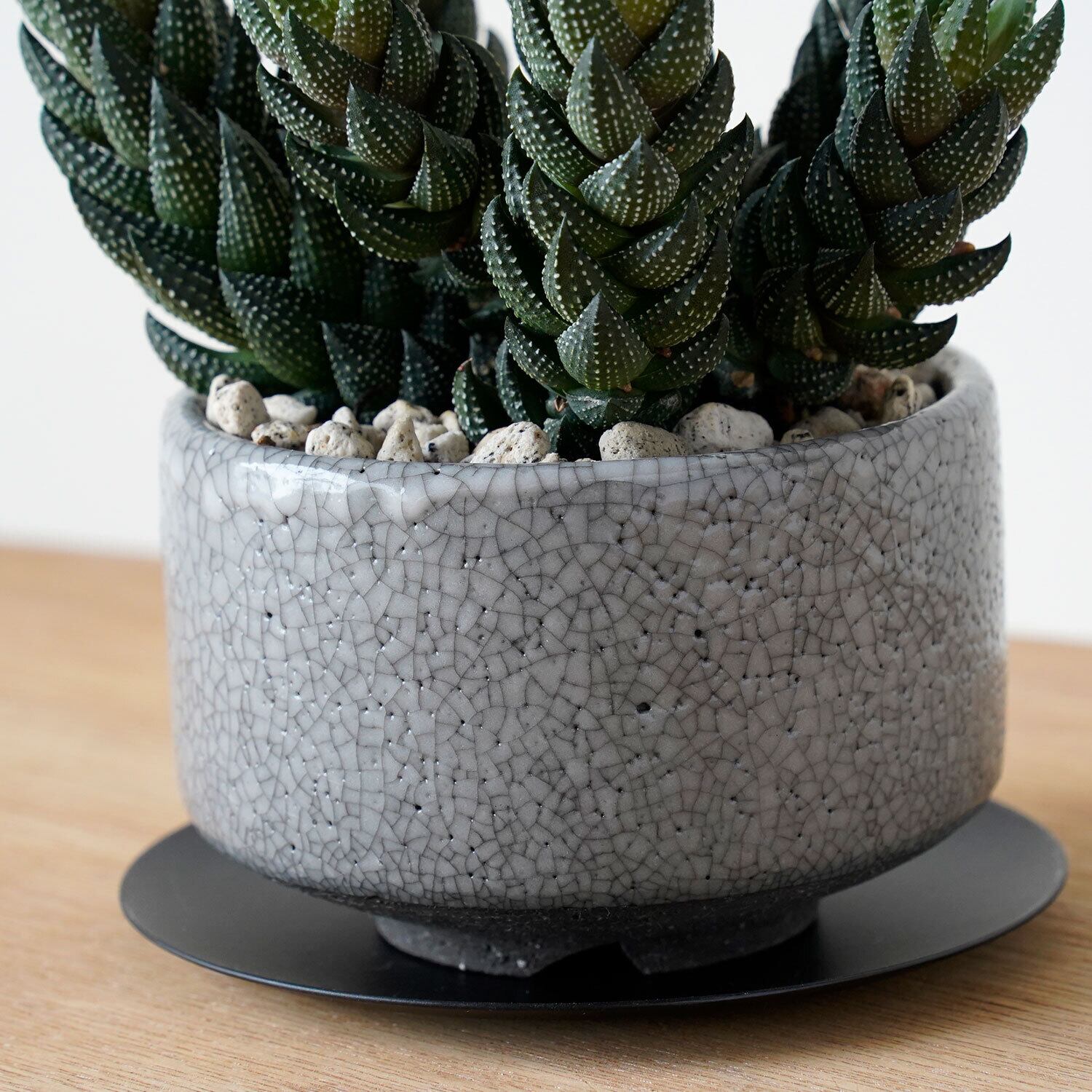 植物を引き立てるシンプルな陶器の鉢、スチールの受皿のセット。