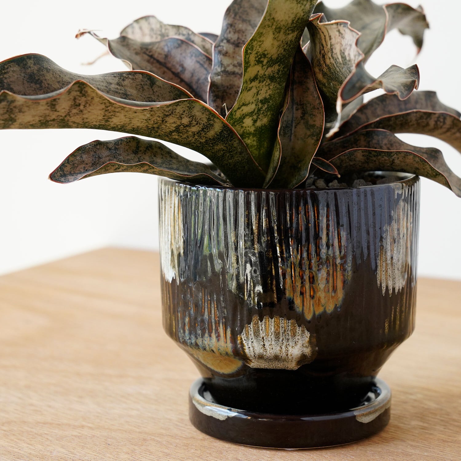 鉢は国産のしっかりした鉢、受皿はスチール製です。