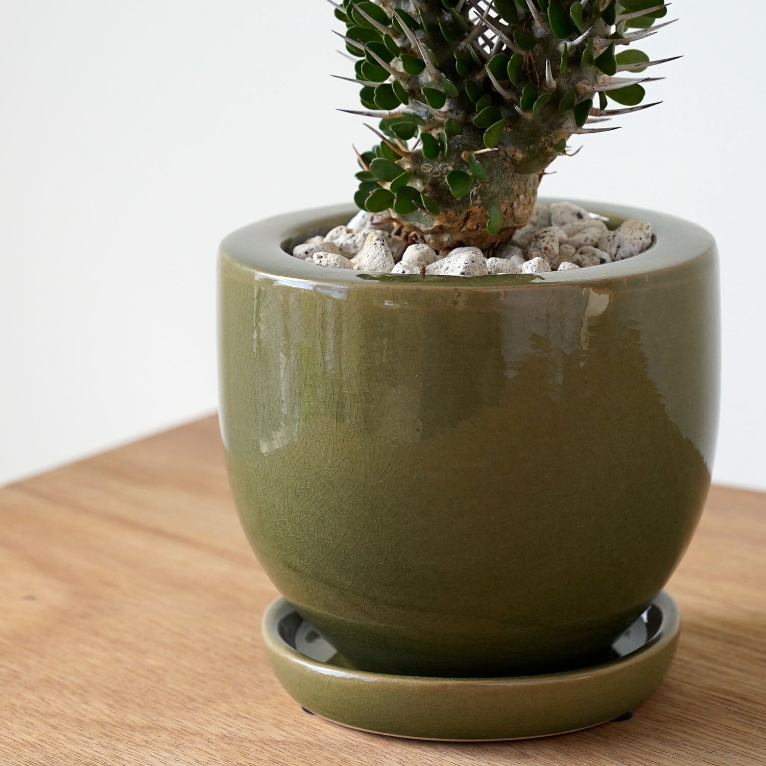 コンパクトなテーブルサイズ。しっかり植物に日光が当たる場所が適所。南の窓辺や屋外に置きましょう。植物を引き立てるシンプルな鉢・受皿は陶器製。