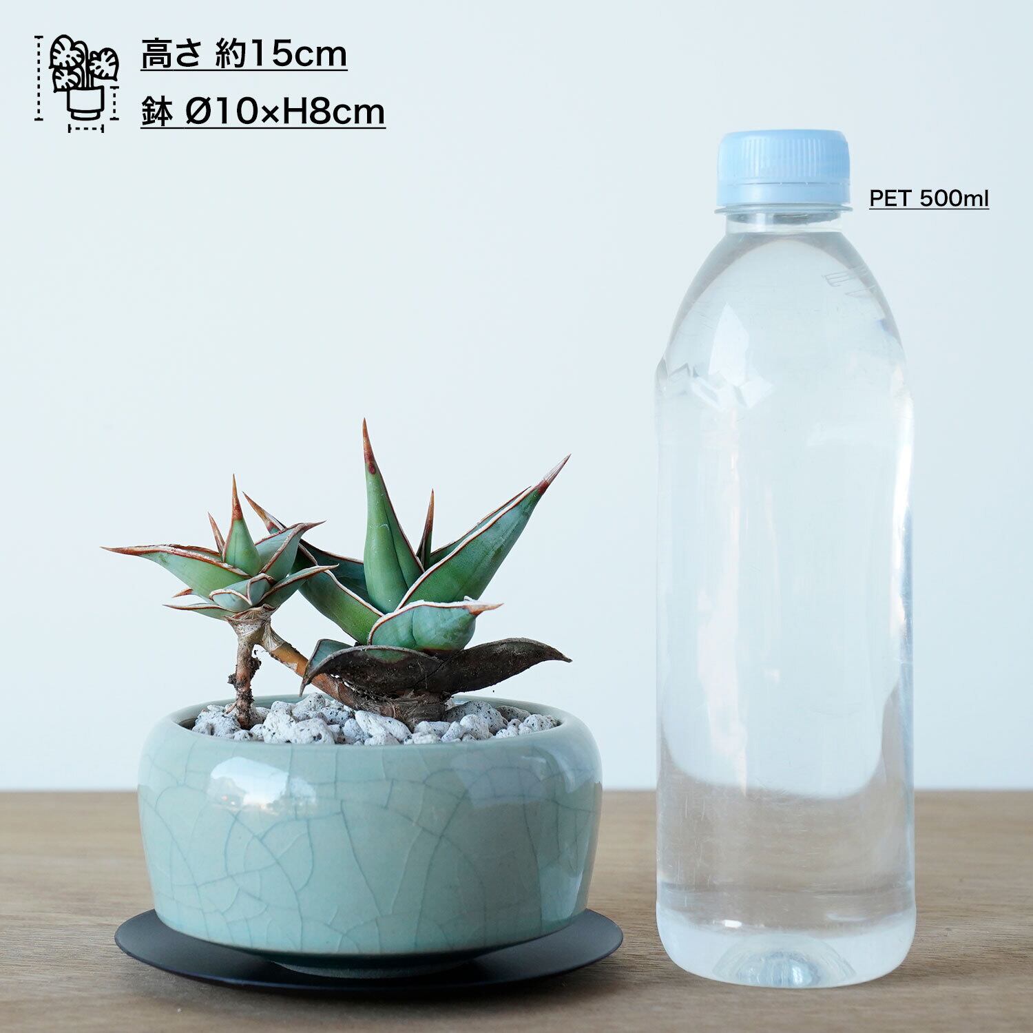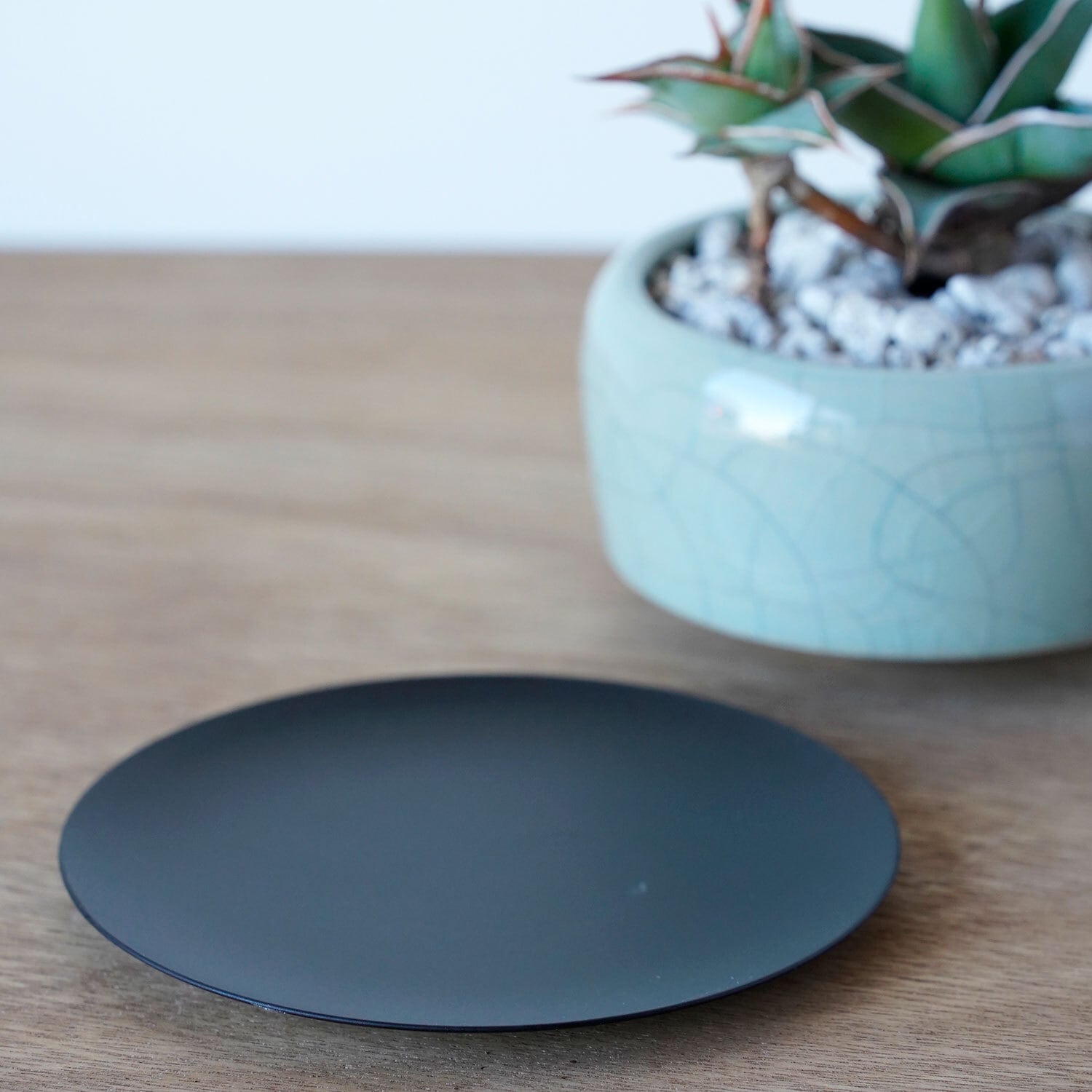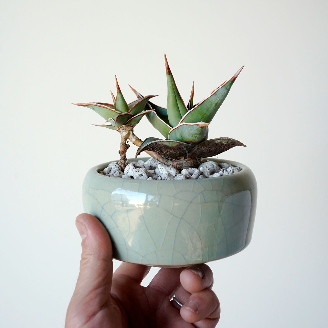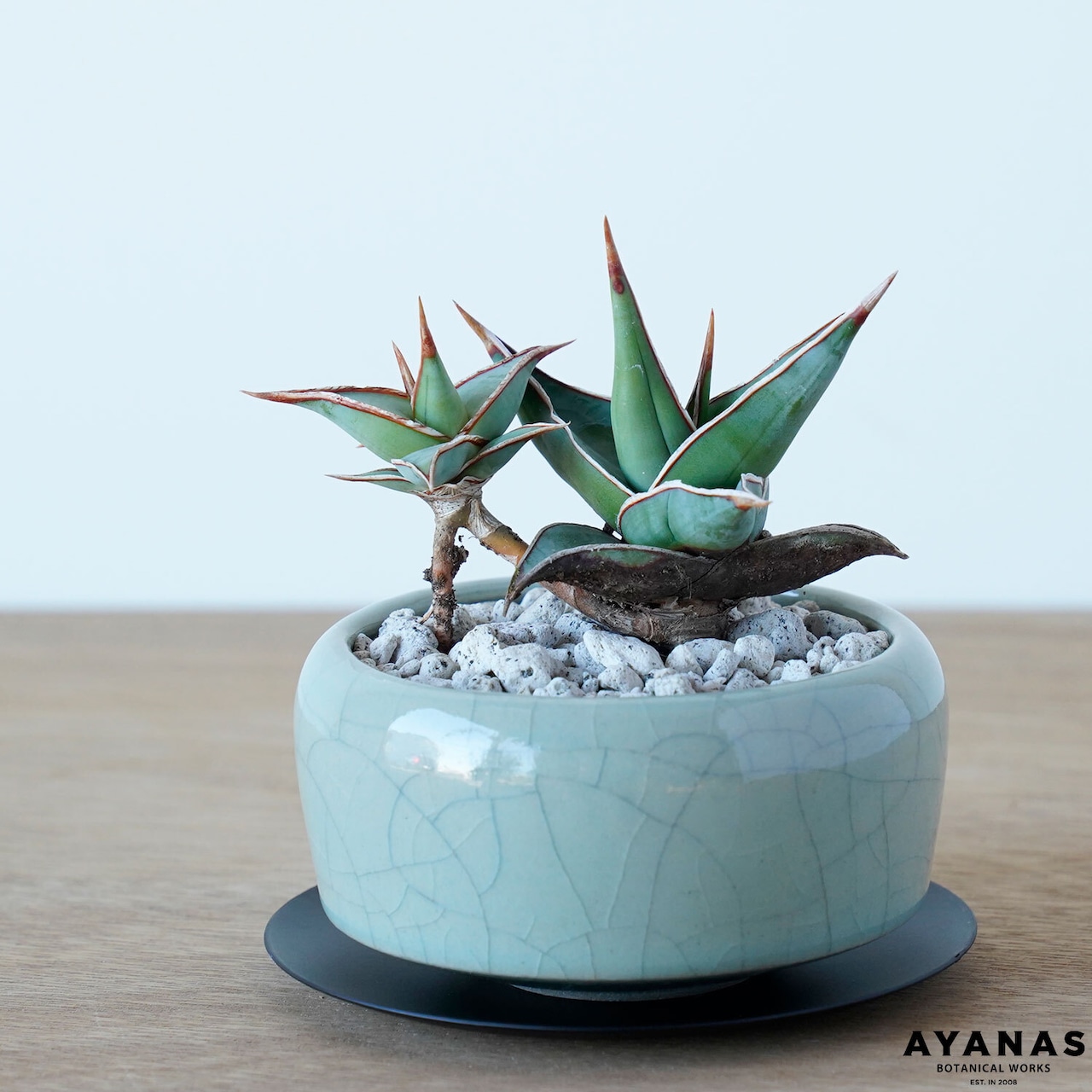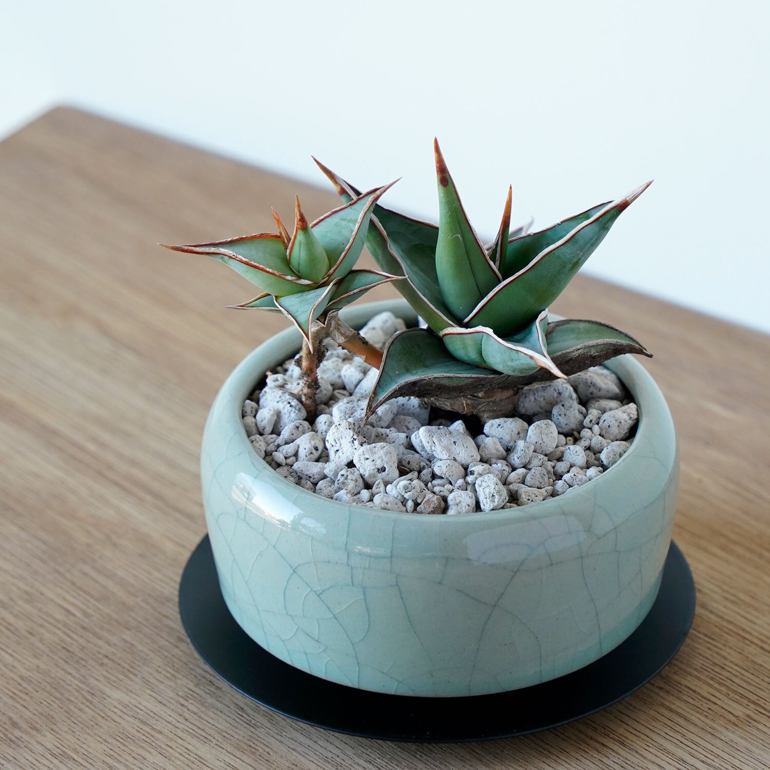 ピンギイキュラの色味に同調した淡い色味の鉢。植物を引き立てる平鉢(浅い鉢)。貫入(表面に入るひび模様)の風合いが特徴です。鉢は陶器、受皿はスチール製。