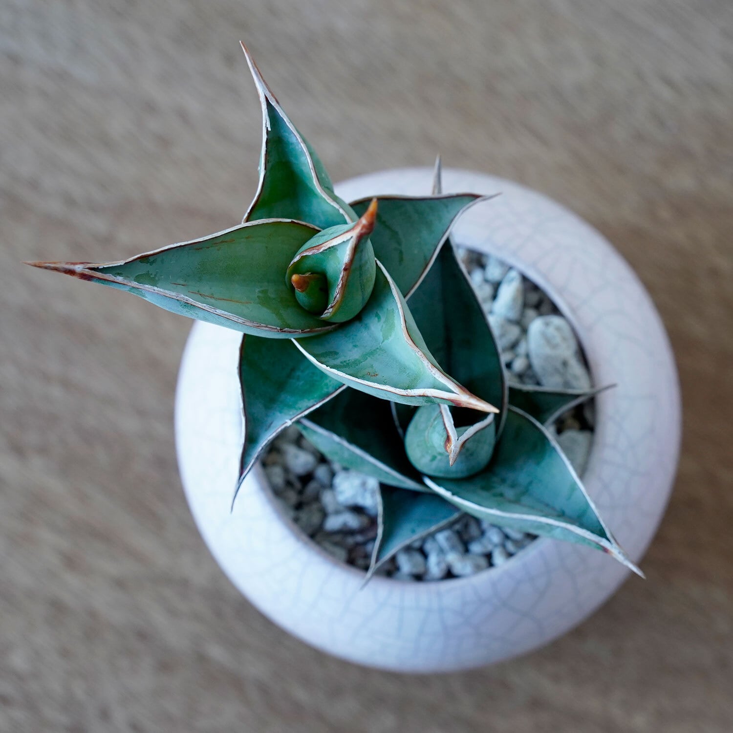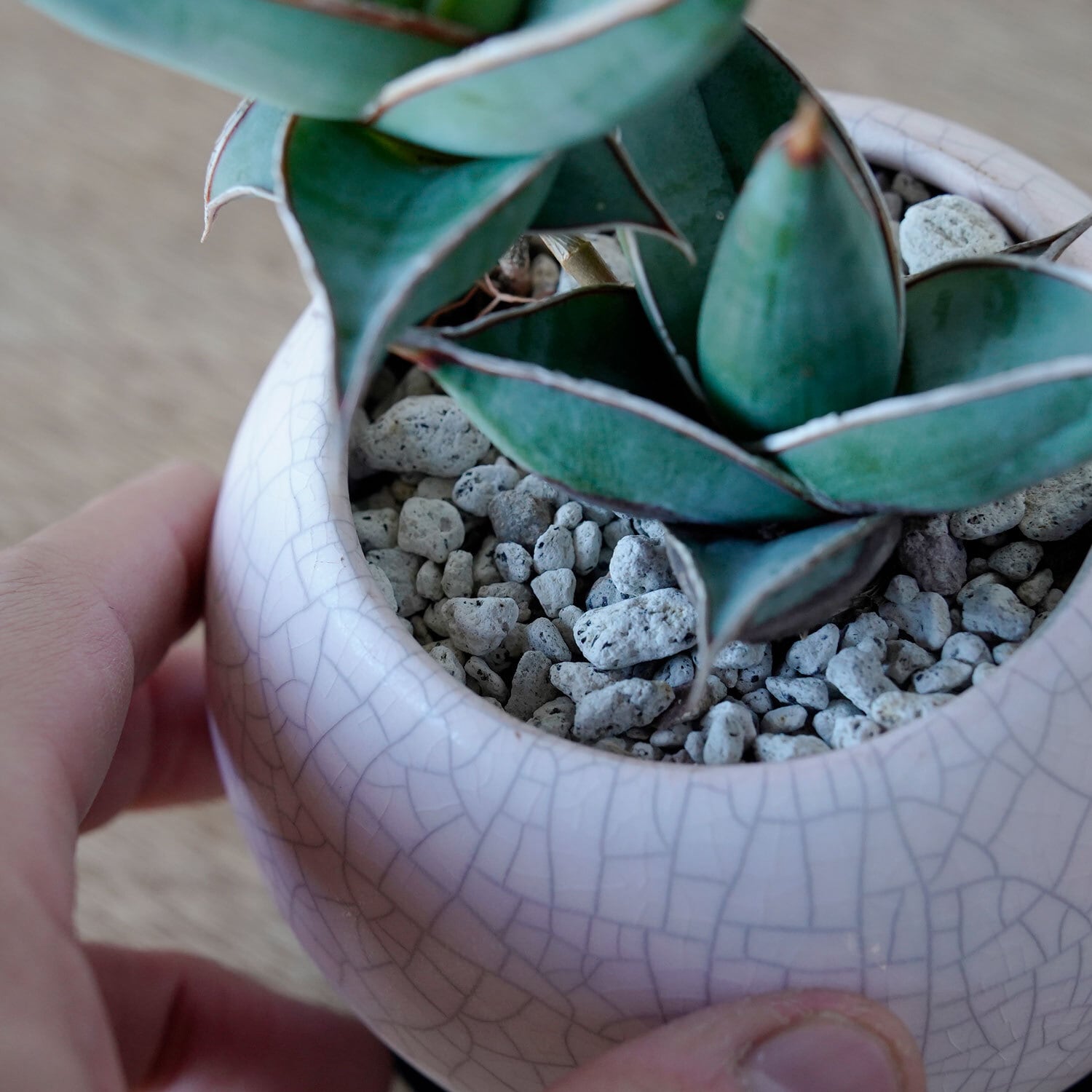 土の表面に敷いてる軽石を退けてみて、土がサラサラに乾いていたらたっぷりと水やり。毎日与える必要はありません。春夏は週1〜2回。気温の低い時期は休眠するので、11月から3月は一切水やりしなくてOK。
