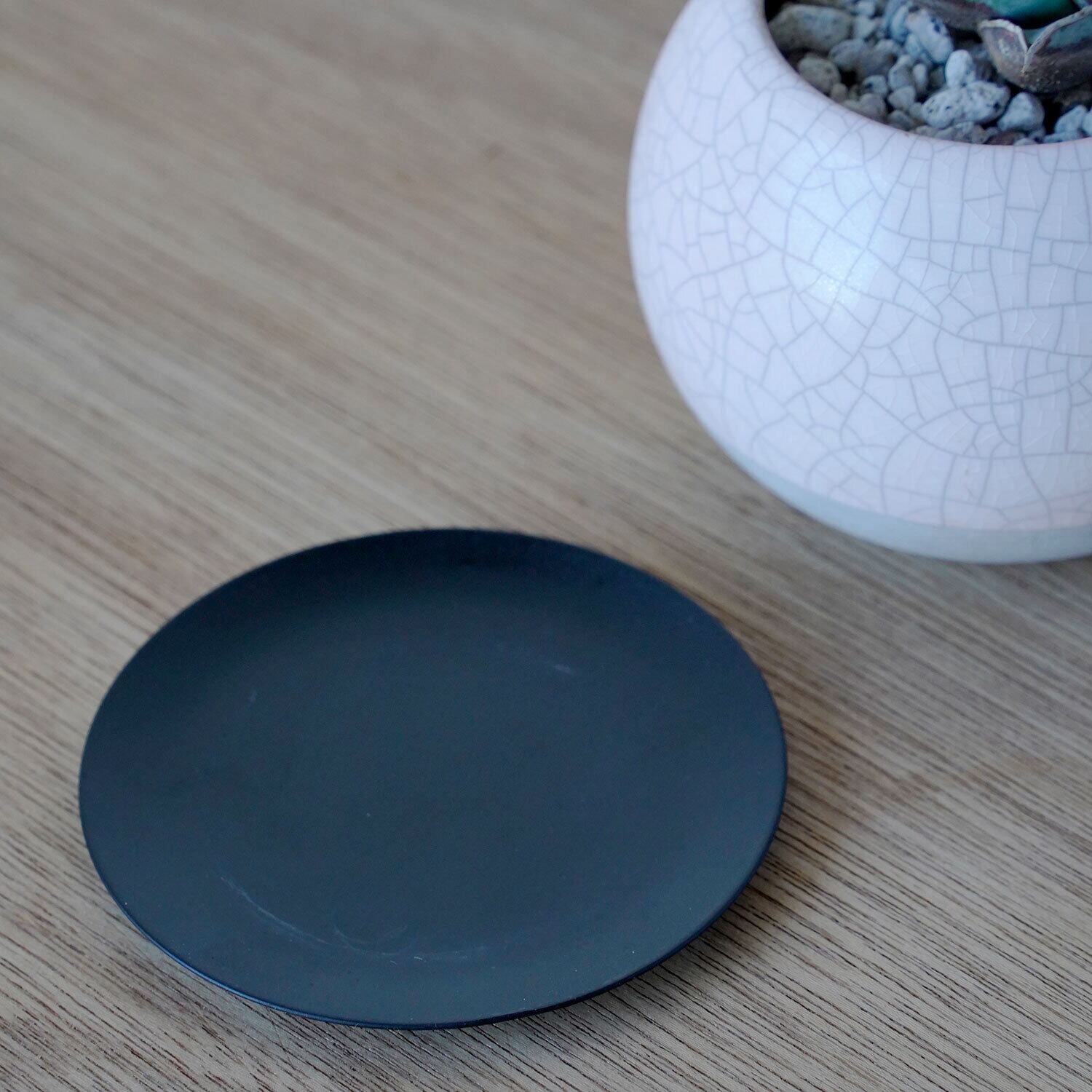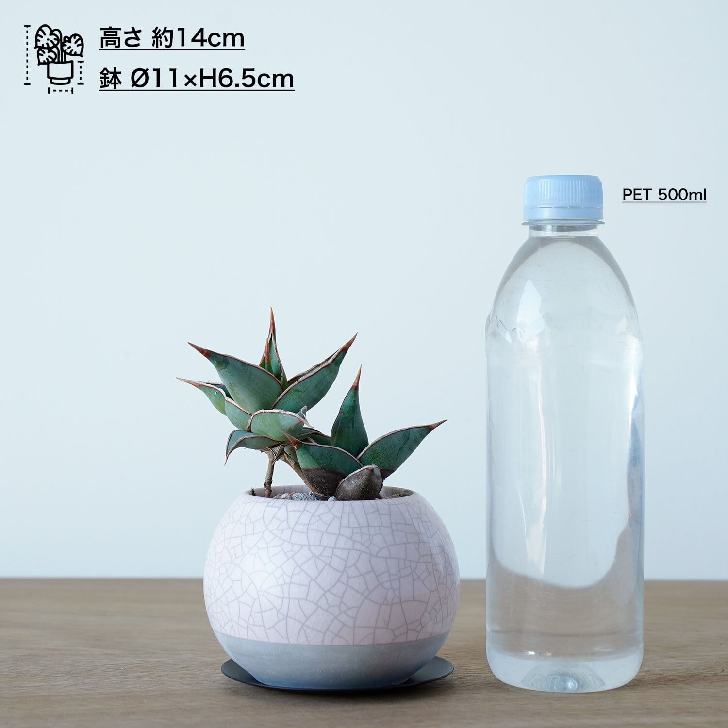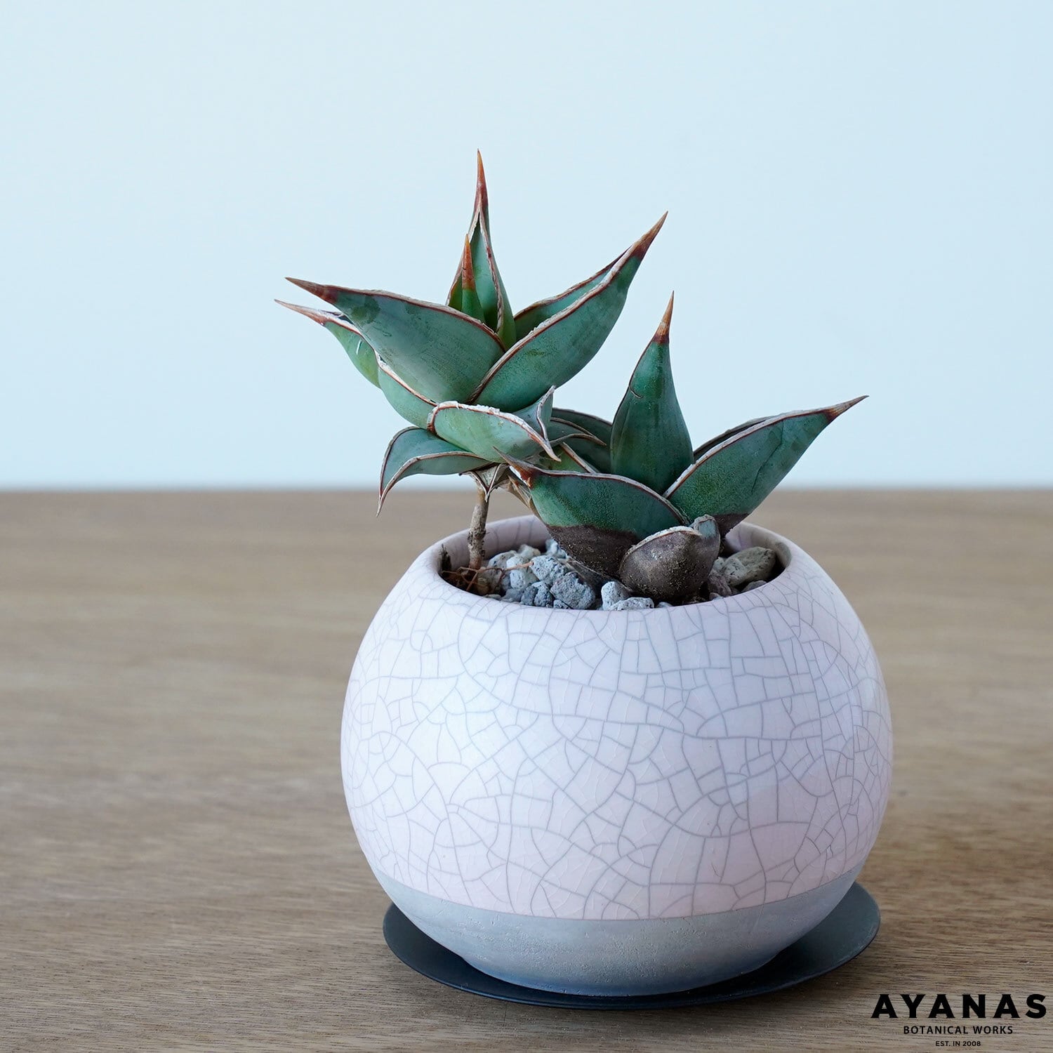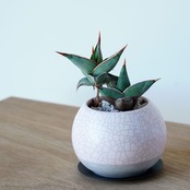 ピンギイキュラとシンクロする淡い色味(淡桃色)の鉢。貫入(表面に入るひび模様)の風合いが特徴です。鉢は陶器、受皿はスチール製。