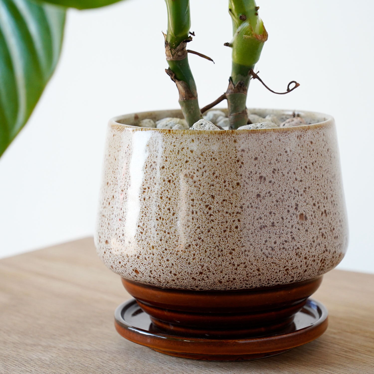 ベージュ、茶系の素朴なデザインの陶器製植木鉢・受皿のセット。