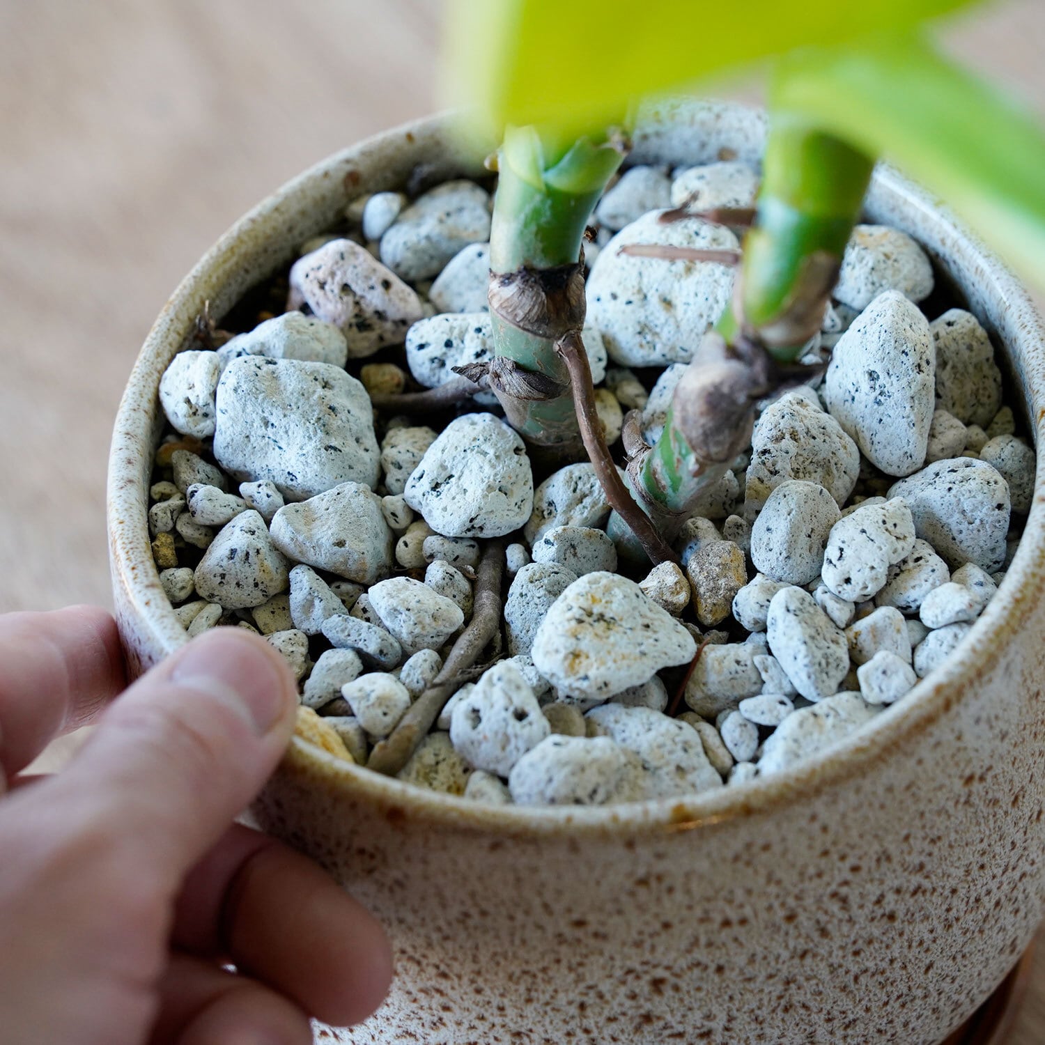 土の表面に敷いてる石を退けてみて、土がサラサラに乾いていたらたっぷりと水やり。毎日与える必要はありません。