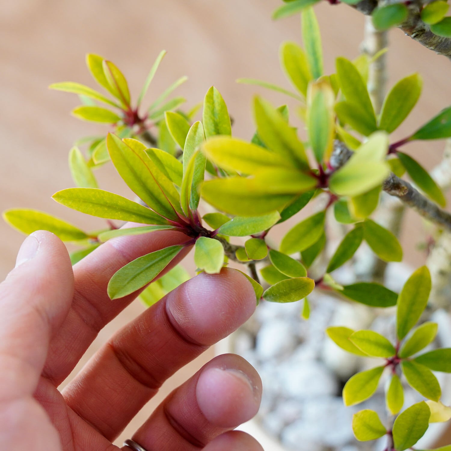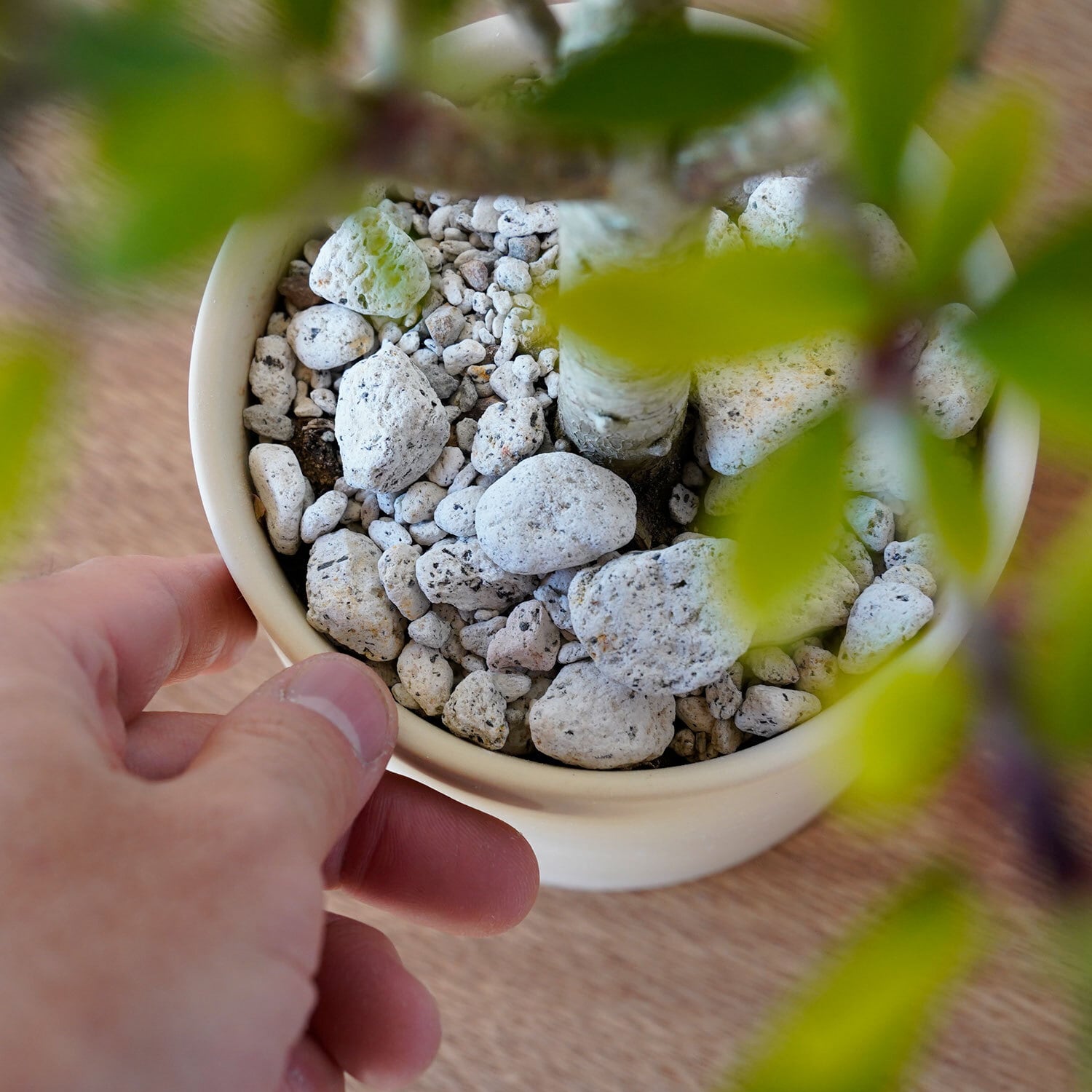 土の表面に敷いてる軽石を退けてみて、土がサラサラに乾いていたらたっぷりと水やり。毎日与える必要はありません。