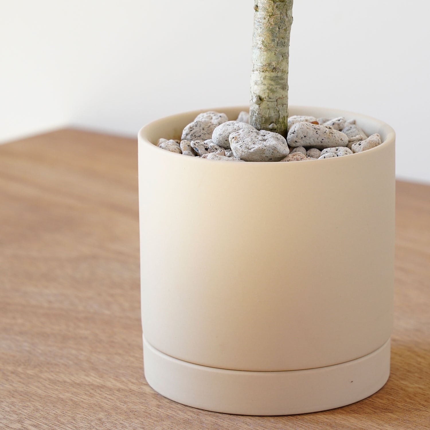 マットな質感、ベージュの陶器の植木鉢・受皿のセット。