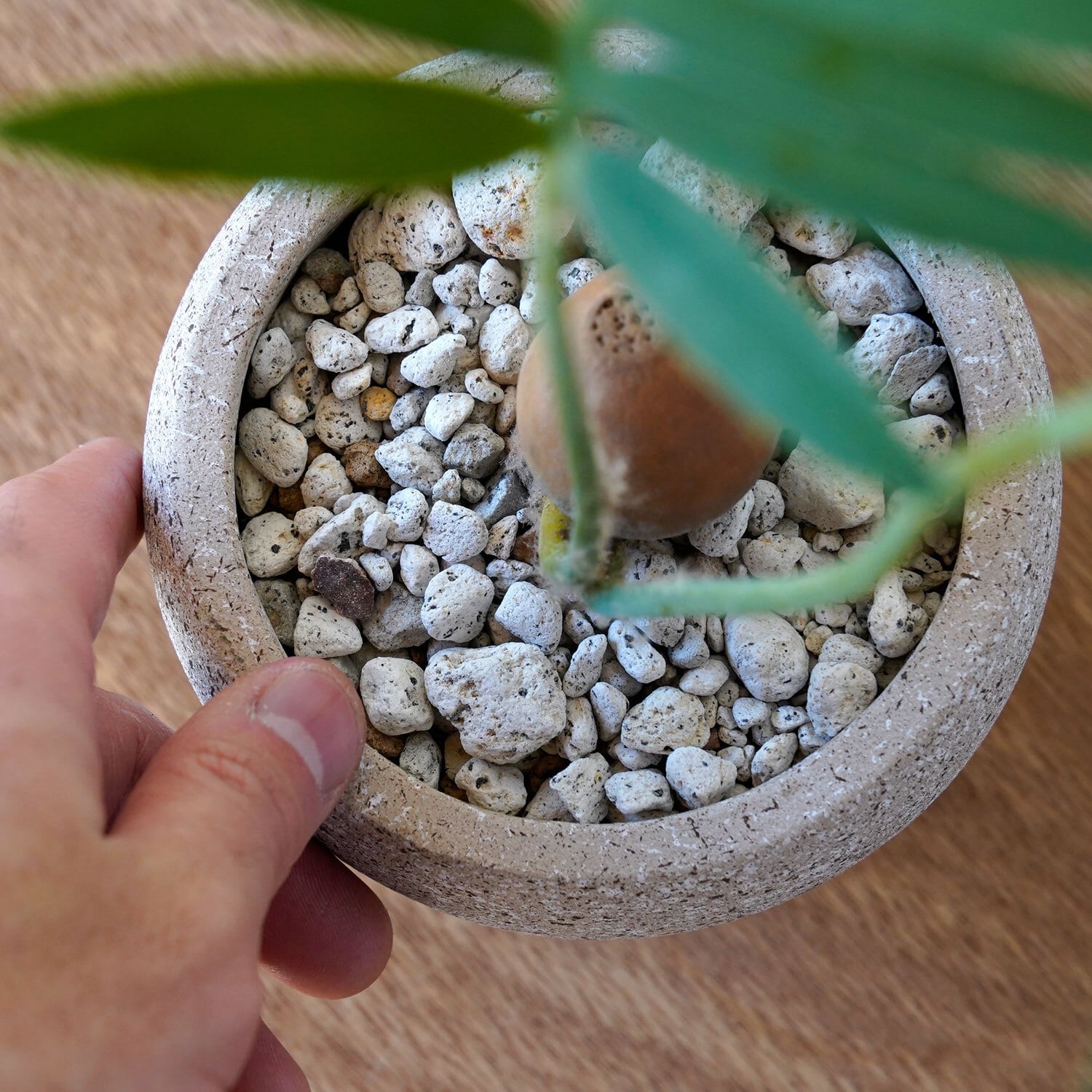土の表面に敷いてる軽石を退けてみて、土がサラサラに乾いていたらたっぷりと水やり。毎日与える必要はありません。