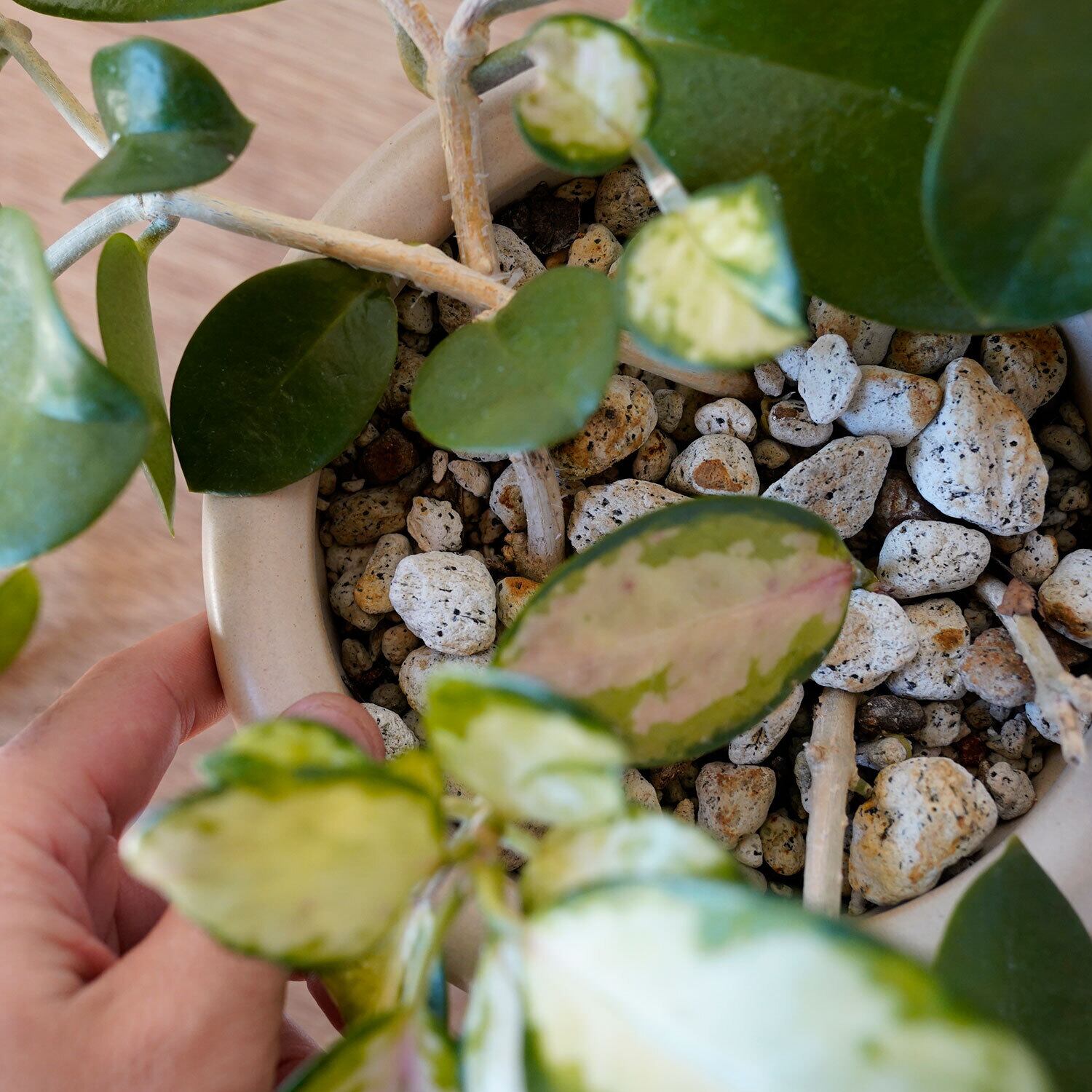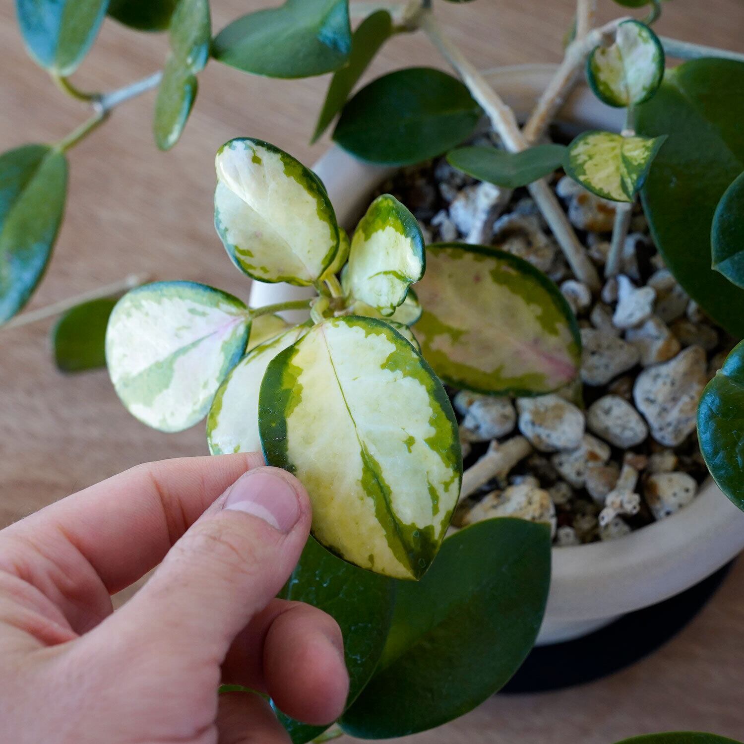 数時間でも日光が当たるような場所に置きましょう。ホヤの仲間は蒸れを嫌うので空気が澱まないよう、一日5分でも十分な換気を行ったり、サーキュレーターでそよ風のような流れを作ってあげるのも効果的です。エアコンの乾燥した風は苦手ですので、直接当たらないよう注意しましょう。それなのに、湿度は好みます。霧吹きでこまめに葉水を与えます。湿度が好きだけど、蒸れるのは嫌い。なんとなく覚えておいてください。