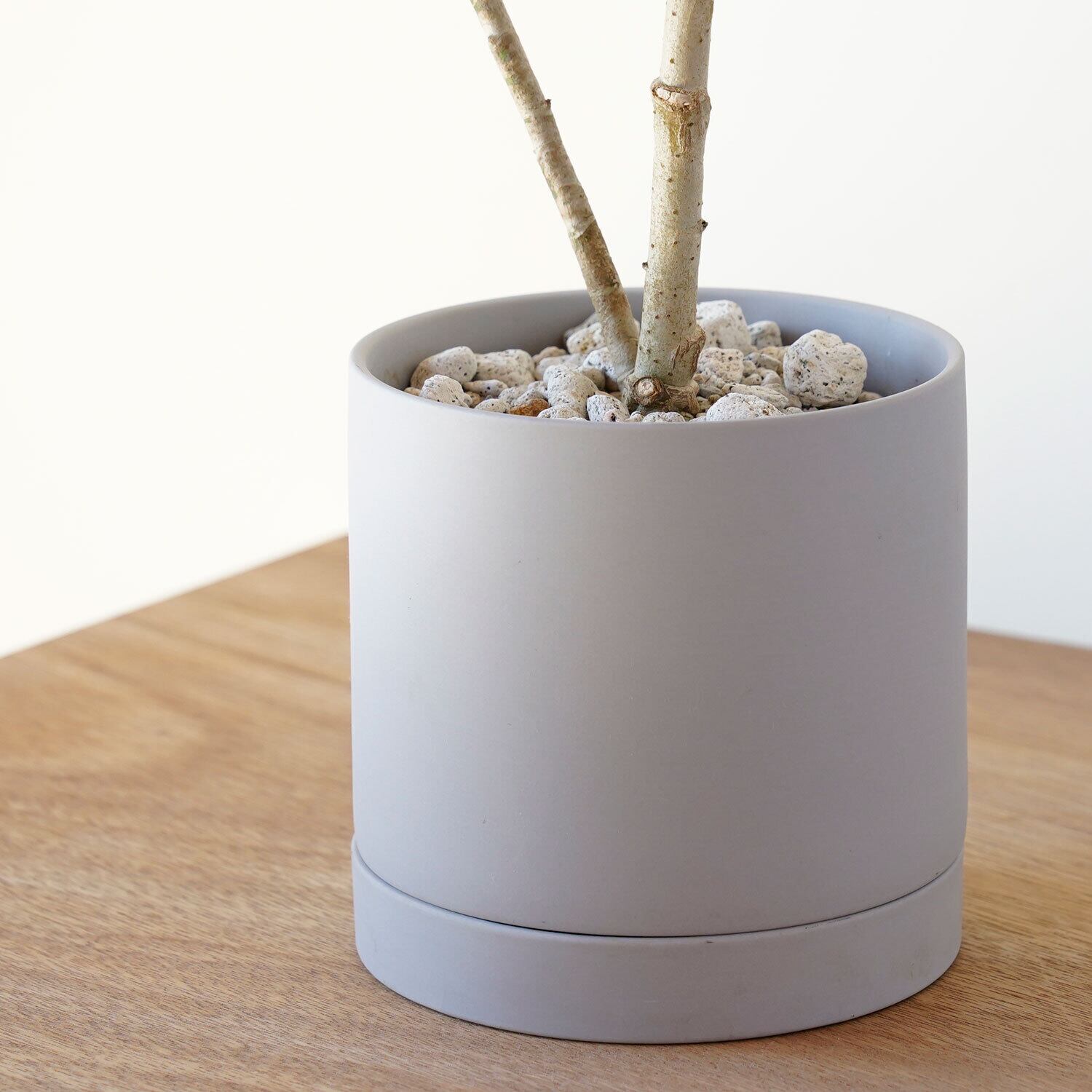 明るいグレー、マットな質感、陶器の植木鉢・受皿のセット。