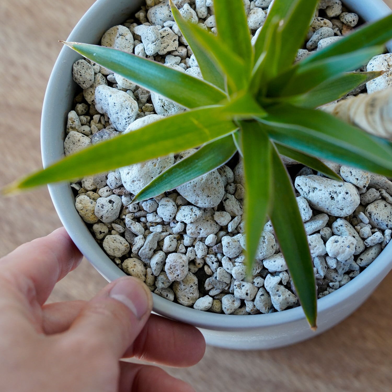 土の表面に敷いてる軽石を退けてみて、土がサラサラに乾いていたらたっぷりと水やり。毎日与える必要はありません。