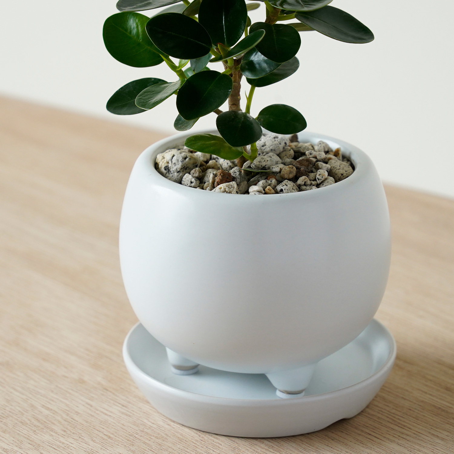 半艶の白、シンプルな陶器の鉢・受皿のセット。鉢底穴あり。