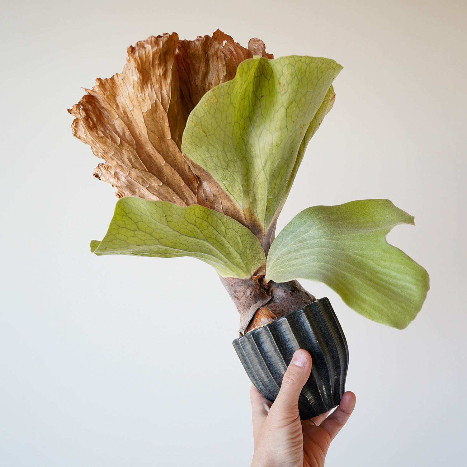 徐々に鉢を包み込むように侵食し始めているビカクシダ。