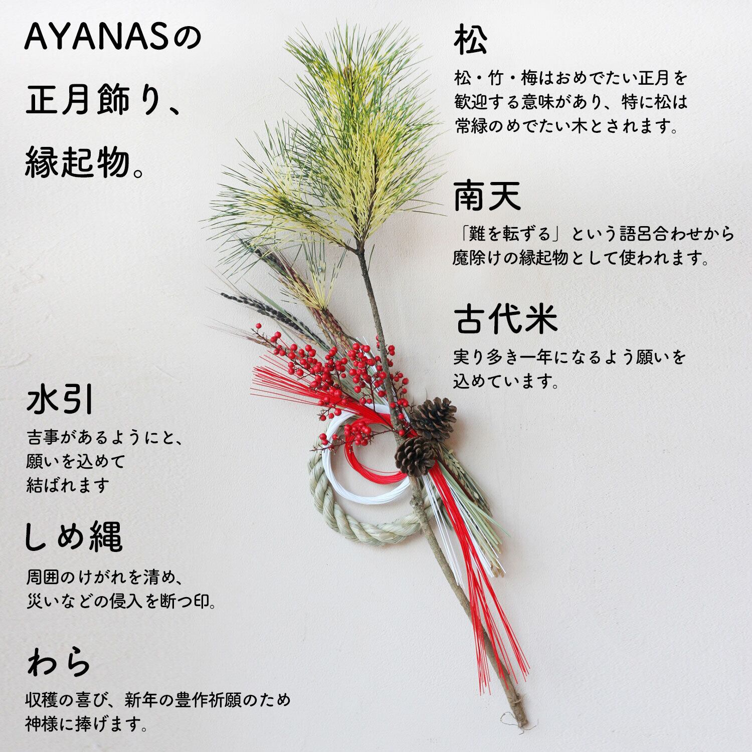 根引き松、南天、松かさ、古代米、稲穂、しめ縄、水引など縁起物を組み合わせて、一つ一つ手作りでご用意いたします。