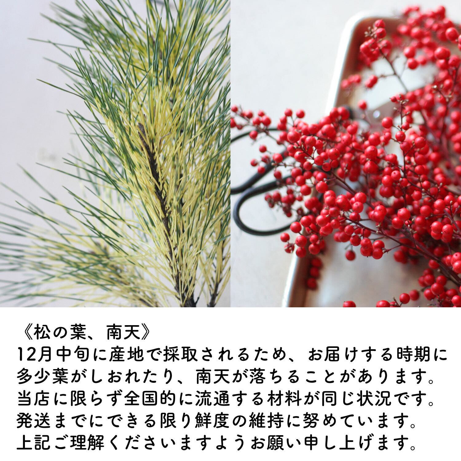 12月中旬に産地で採取されるため、お届け時期に多少葉がしおれたり、南天が落ちることがあります。当店に限ら全国的に流通する材料が同じ状況です。仕入れから発送までの間、できる限り鮮度の維持に努めています。こちらご理解下さいますようお願い申し上げます。