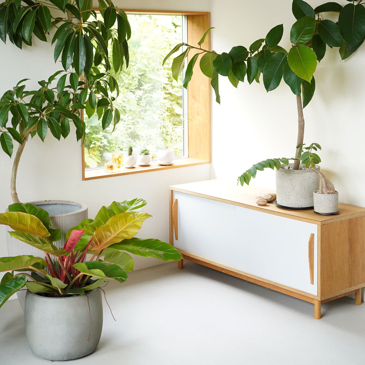 明るい日陰でも育てやすいのがこの子のいいところ。窓から離れた場所でも元気に育ちます。店舗やオフィス、照明だけの空間にもなじみます。